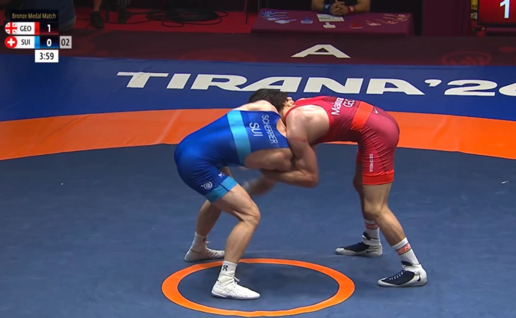 Samuel Scherrer – hier im Bronze-Kampf gegen den Georgier Maisuradze – belegte den 5. Schlussrang bis 92 kg (Screenshot UWW).